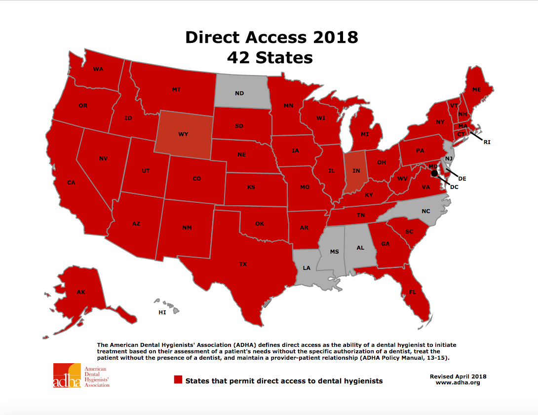 The American Dental Hygienists’ Association defines direct access as “the ability of a dental hygienist to initiate treatment based on their assessment of a patient’s needs without the specific authorization of a dentist, treat the patient without the presence of a dentist and maintain a provider-patient relationship.”