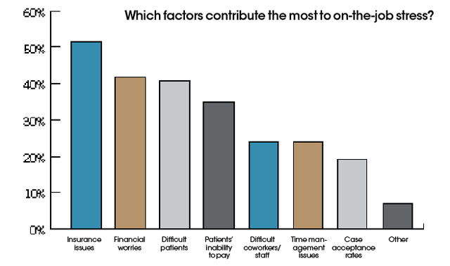 Insurance isn’t just something dentists seem to loathe, but it’s also something that contributes to a great deal of their on-the-job stress. Of our respondents, 51.4 percent said insurance contributed to raising their blood pressure followed by financial worries (41.9 percent) and difficult patients (40.6 percent).