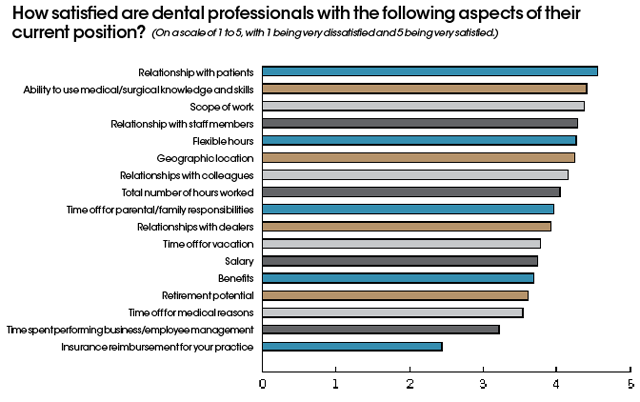 “More than half of the survey respondents cited insurance reimbursement as a source of stress in their practices,” she said. “The logical conclusion is that they’re referring to lower or unsatisfactory reimbursement. During my travels around the country, I hear from audiences who are upset with insurance processing, the lowering of rates and the increased scrutiny PPO providers endure. Occasionally, I hear from offices that are satisfied with reimbursement levels, but those plans are few and far between.