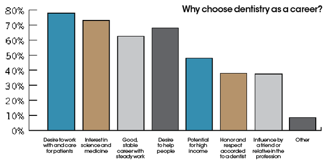 One of the biggest things we wanted to know was why dentists became dentists. As expected, the most popular answer was “a desire to work with and care for patients.” However, one of the biggest surprises was the low number of dentists who answered for “honor and respect accorded to a dentist.”