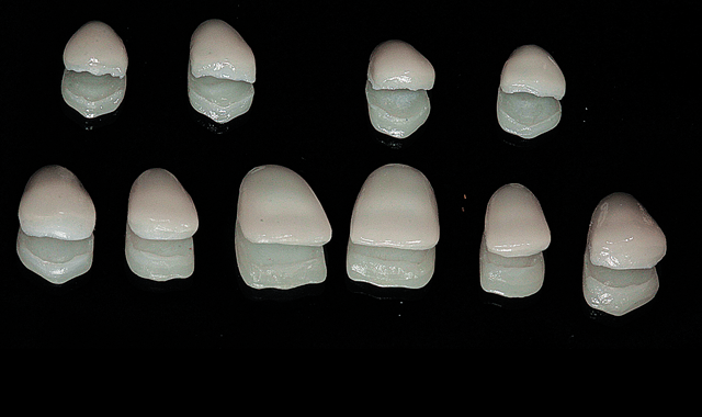 Not all composite resin cements are suited for this technique. Some are too viscous and some have too short a working time in ambient light. I found Calibra, by Dentsply Sirona, an ideal material for this process. Its viscosity is flowable in nature and it possesses a “stay-put” property that allows the restoration to stay in place for clean up before curing. Figure 1 shows ten ceramic laminate veneers ready for placement and photographed on a mirror surface.