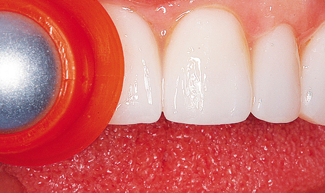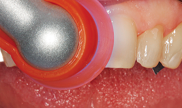 The LED curing light was used to “tack” the laminates to place with a quick two second burst of light (Fig. 13). Floss was used to remove excess proximal composite at this stage. A number 12 surgical blade was used to aid in removing inter-proximal excess.