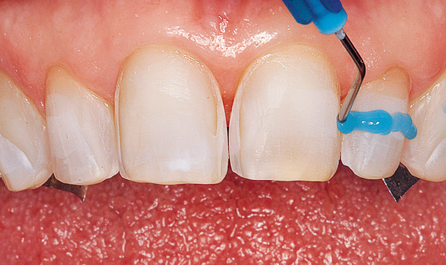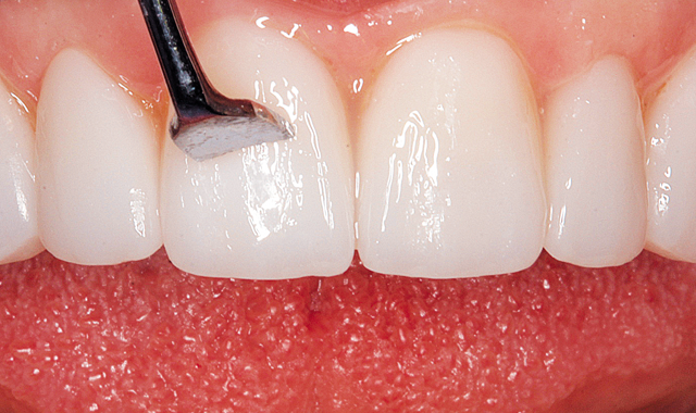 The metal matrix strips were removed from the inter-proximal areas distal the canines. The instrument was again used to verify the seat of each laminate veneer (Fig. 12). The “stay put” property of Calibra aids in the positioning.