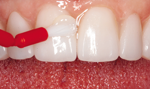 It was decided to place the six anterior veneers at once and then the two premolar veneers together one side at a time. Metal inter-proximal matrixes were placed distal to both canine teeth to protect the adjacent premolars from the adhesive chemicals. A line of phosphoric acid etching gel (Dentsply Sirona) was placed on the prepared surfaces using a syringe (Fig. 3) and quickly brushed across the surfaces allowing it to dwell for ten seconds before thoroughly rinsing with water from an air/water syringe and lightly air drying.