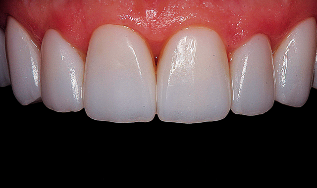 Figure 16 shows the incisal view of the six anterior laminate veneers in place. The facial view of the finished case can be seen in Figure 17, below.