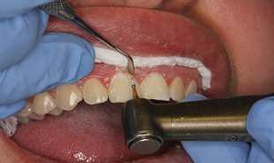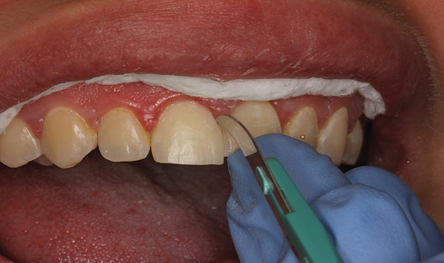 A #12 scalpel was used to remove any interproximal flash and define the facial embrasure (Fig. 9).