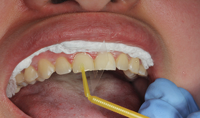 A mylar strip was used to provide isolation from the adjacent central incisor. All-Bond Universal adhesive was applied in two coats to the etched and visibly moist enamel, followed by gentle air pressure to thin out the adhesive and evaporate the solvent. In this case a wedge was not used, as the patient was not anesthetized. The adhesive was light-cured for a minimum of 10 seconds (Fig. 5).
