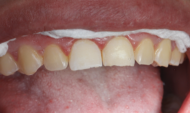 It is noteworthy that no dentin was exposed in the preparation. Etchant was applied to the right central incisor for 15 seconds and thoroughly rinsed and dried (Fig. 3).