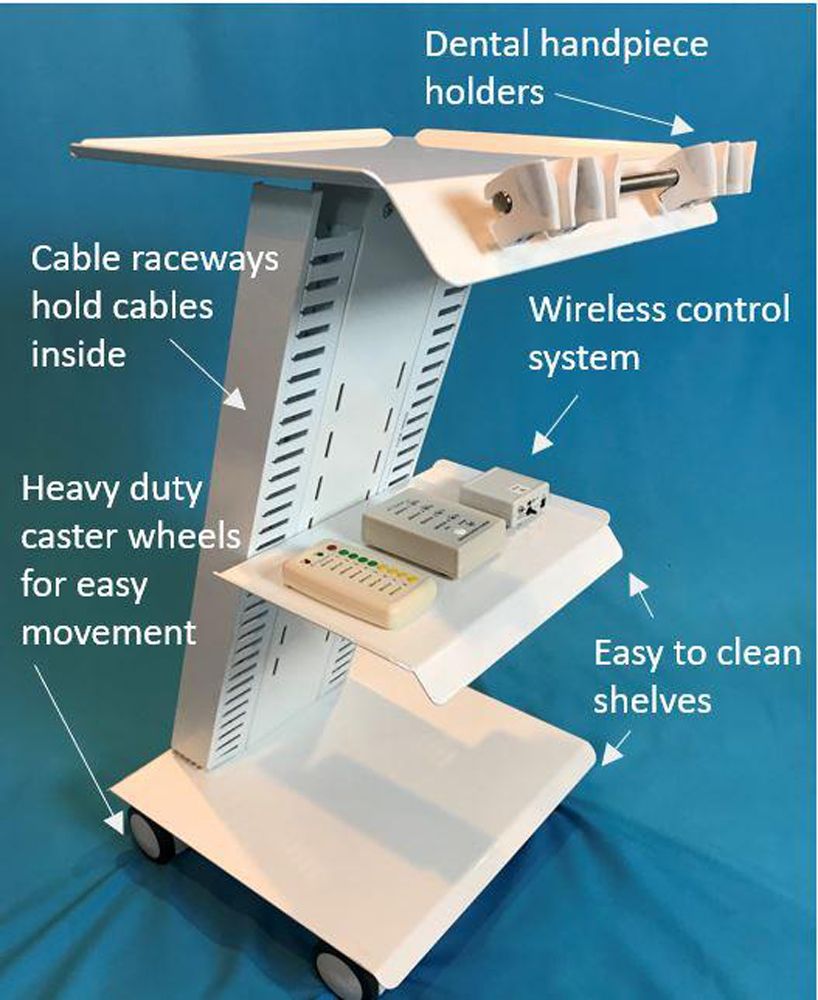 • A Wireless Control System that eliminates the need for extra foot pedals by instead controlling all of the dental devices on the cart utilizing a single operatory foot pedal.