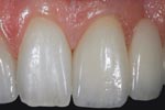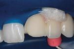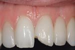 As in the example here, closer examination reveals the chip is located on an abutment of a zirconia bridge. Replacing the bridge would require cutting off three or more units and redoing them. An alternative dentists and their ceramists can pursue requires the dentist to cut a thin preparation in the facial of the layering ceramic, carefully avoiding the zirconia itself. The ceramist then can wax and press a thin lithium disilicate (IPS e.max Press) veneer to recreate the initial shape and form of the tooth, and prepare the veneer by etching it in the laboratory. The dentist bonds this restoration over the zirconia bridge. This requires isolation with rubber dam and rubber dam sealers, after which the surface of the preparation is etched with hydrofluoric acid. Silane is applied to the veneer and preparation, and a very thin layer of resin cement is used to bond the lithium disilicate restoration over the zirconia bridge and complete the repair. The result is a stronger incisal third that is less likely to fracture and avoids the trauma of removing the multi-unit bridge.