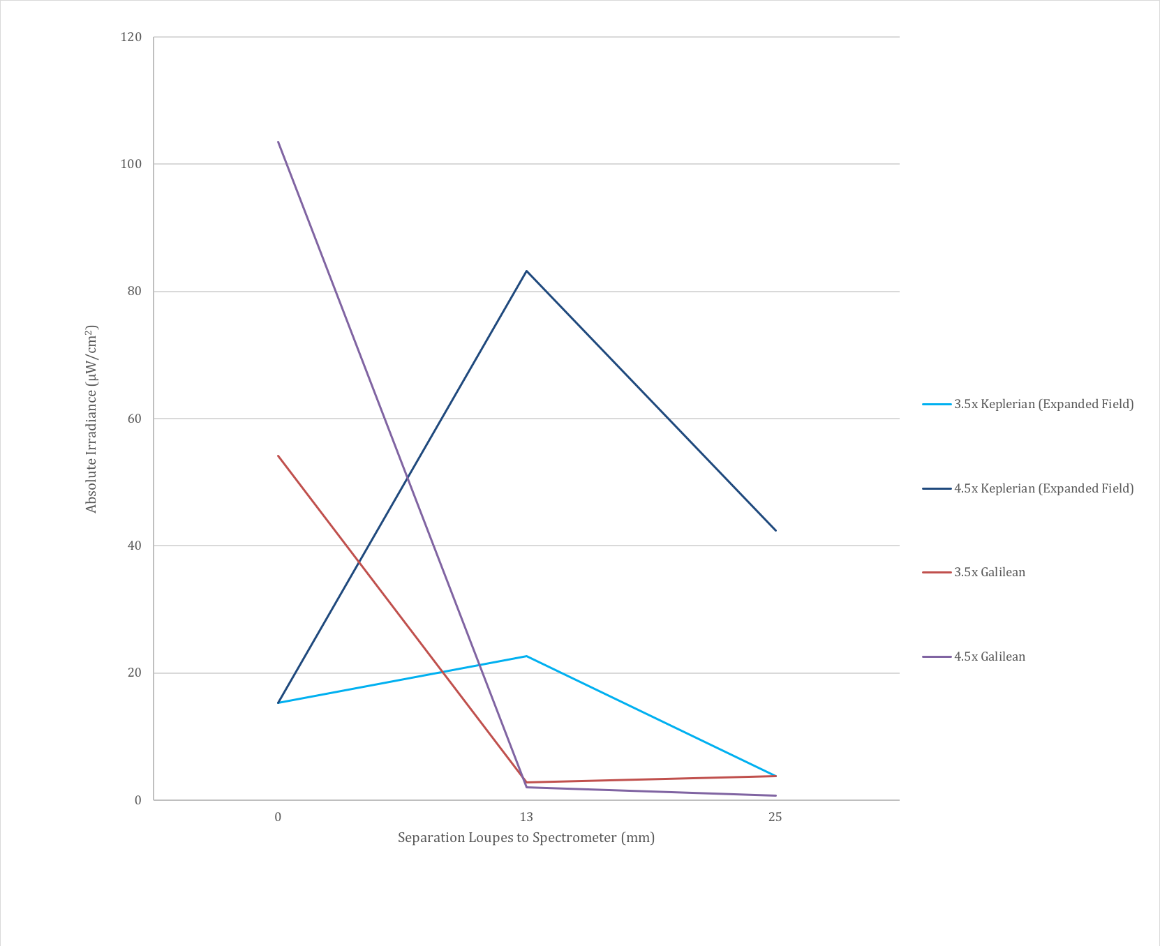 The distance to the telescope matters and results in drastically different results for the Keplerian telescopes compared with the Galilean telescopes. To study this, the absolute irradiance was measured when the spectrometer was in contact with the loupe and at distances of 13 mm and 25 mm behind the loupes. The data indicated there was a significant difference between telescopes, with the Keplerian telescopes increasing in irradiance at a distance of 13 mm com- pared with contact and one inch and the Galilean telescopes abruptly decreasing at a distance of 13 mm and remaining relatively stable in the transition from 13 mm to 25 mm.