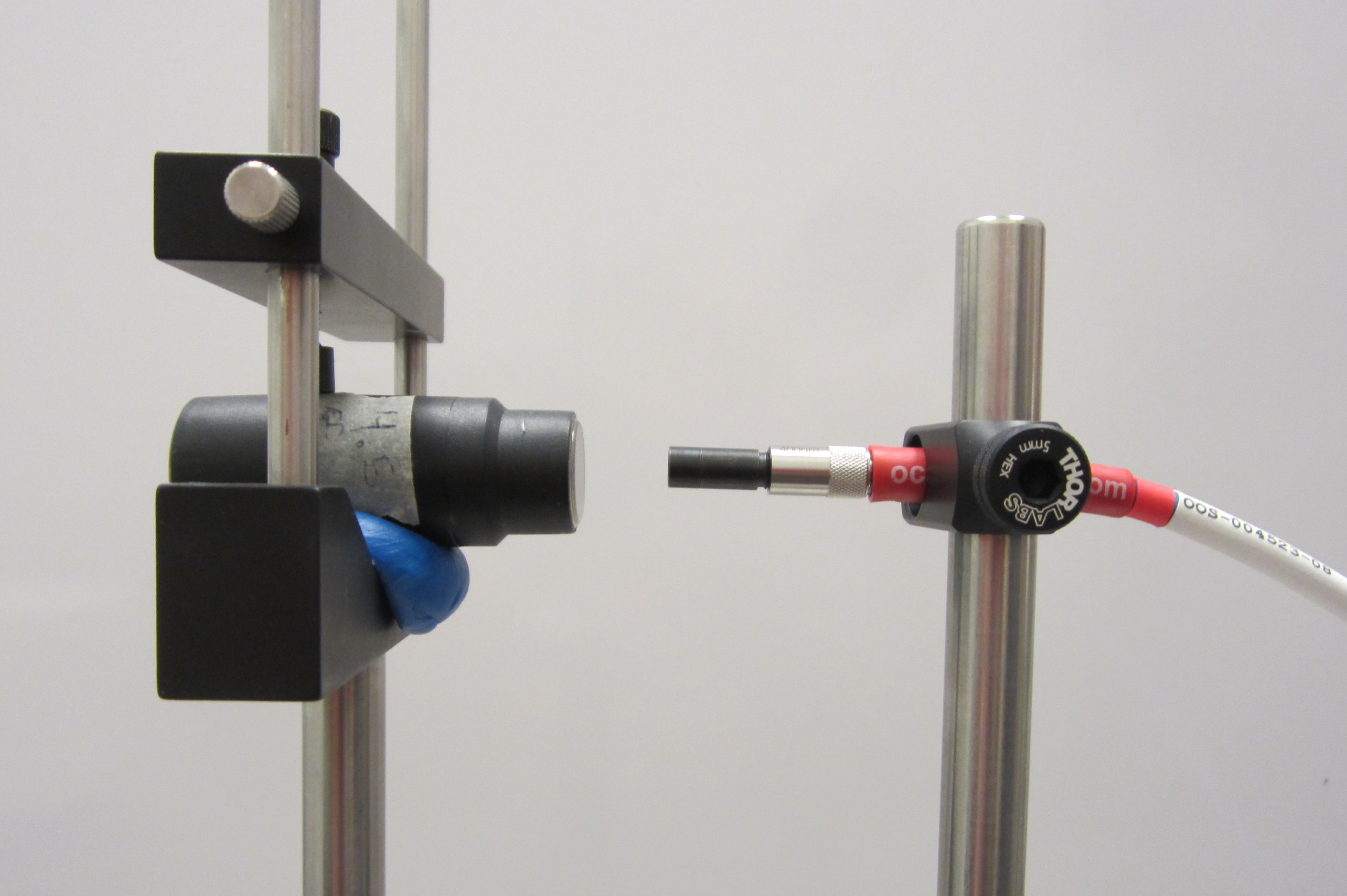 Fig. 1: Spectrometer positioned 13 mm behind lens to simulate the position of the eye exposed to blue light. Fig. 2: Image of configuration set up to measure reflected blue light.