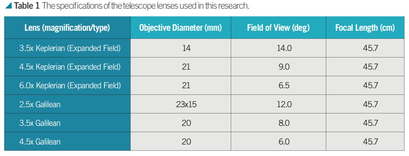 Two different types of telescope lenses were used: Keplerian (expanded field) and Galilean. Lenses were obtained from Designs for Vision, Inc® and for each type of telescope, three different magnifications were used (Table 1).