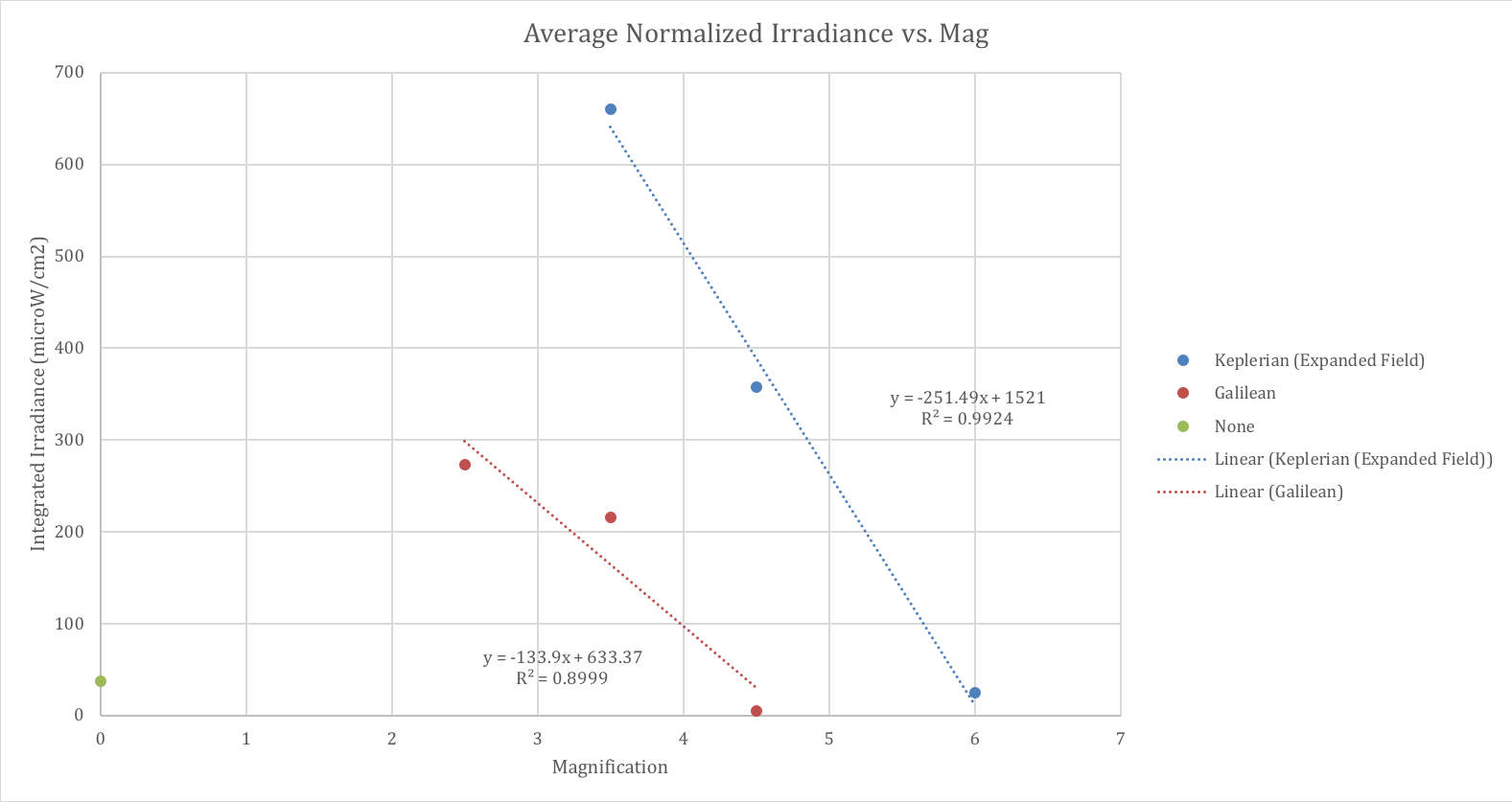 Fig. 4: Average Normalized Irradiance vs. Magnification. The integrated irradiance was normalized to account for the size of the telescope objective (entrance pupil) and the field of view.
