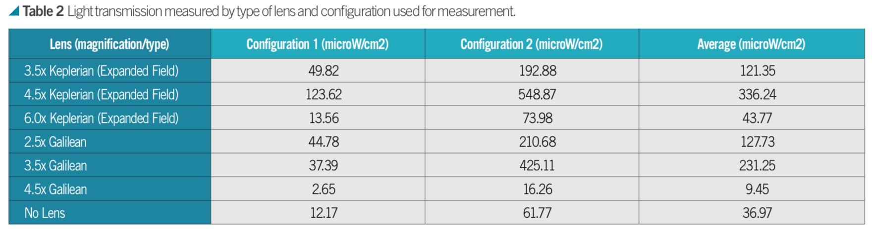 We found that the amount of integrated irradiance measured by the spectrometer through the loupes varied considerably with configuration and type of loupes. There was no clear trend that a larger or smaller magnification resulted in more light transmission with the most light being transmitted by the 4.5x Keplerian lens and the least light by the 4.5x Galilean lens. More light was observed at the corneal plane for all lenses except for 4.5x Galilean (Table 2).