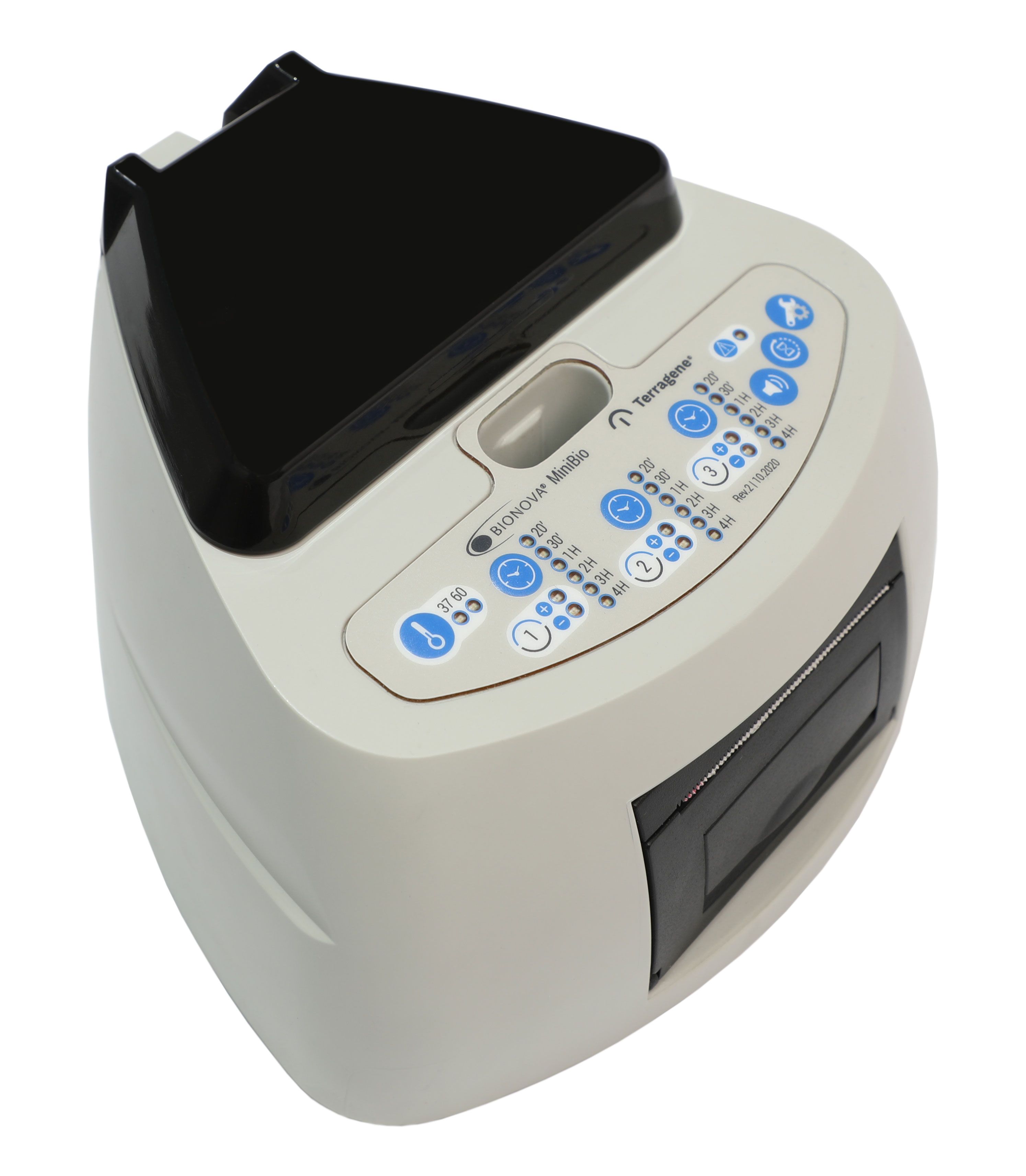 The Tuttnauer MiniBio has 3 wells, so it can test 2 autoclaves and the control simultaneously. Positive and negative results are indicated by green and red LEDs, and the device also contains a tiny printer. All results are printed on a thin strip of paper that can be saved for record-keeping purposes. The device definitely has a remarkable high-tech look, and even better, it runs the test cycle in an impressive 20 minutes.