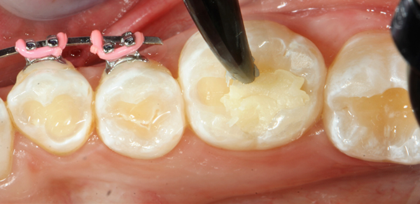 After local anesthetic was administered, all visible decay was removed (Fig. 1) and, following the latest Dental Caries 2018: New Insights recommendation, all “affected” dentin layers were also removed. The preparation was disinfected with 5 percent gluteraldehyde-35 percent hydroxylethyl methacrylate (HEMA) formulations applied with Ball-Point Applicators™by KaVo Kerr.