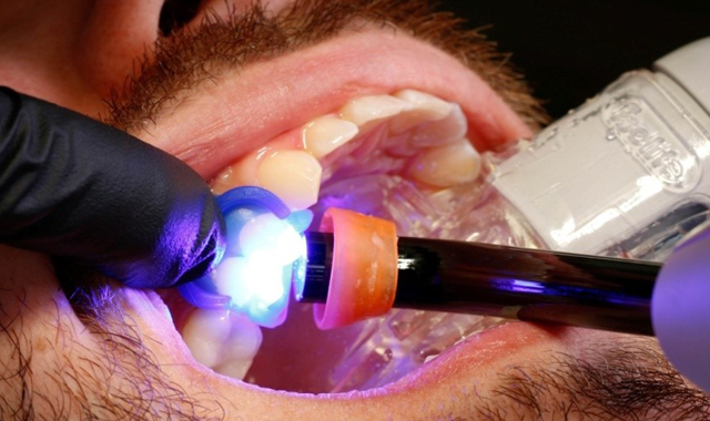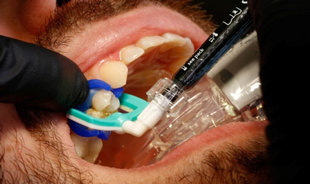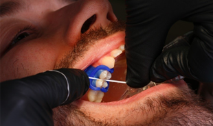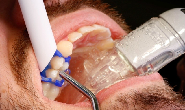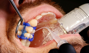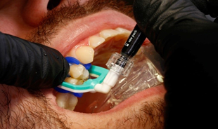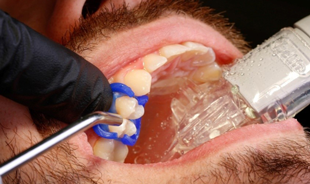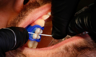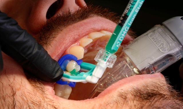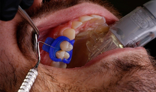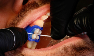 Step 1-Cleaning the surface of the tooth to be treated. Before the start of treatment, clean the affected tooth and adjacent teeth. Remove any cleaning residue with water spray. Create a sufficiently dry working field. You should take appropriate measures such as rubber dam, liquid dam or similar to protect the gingival tissue (Fig. 2).