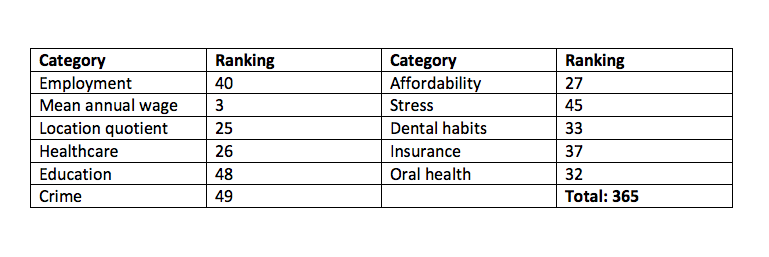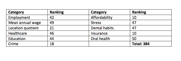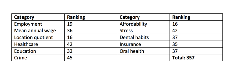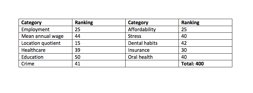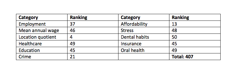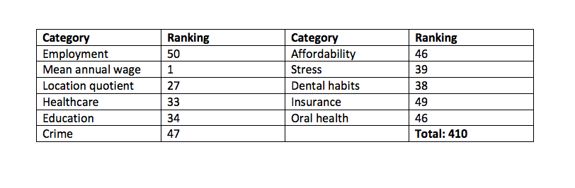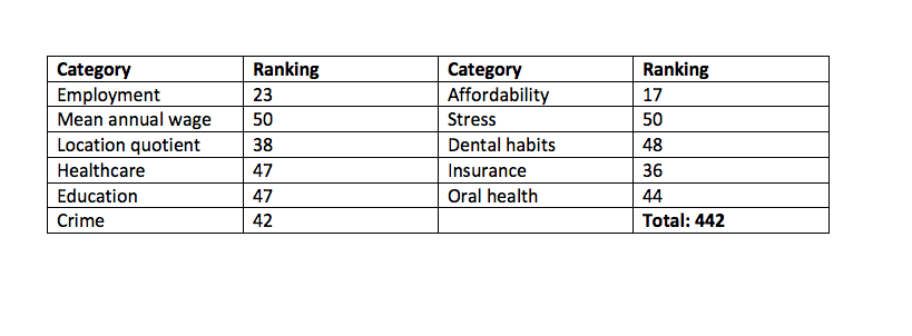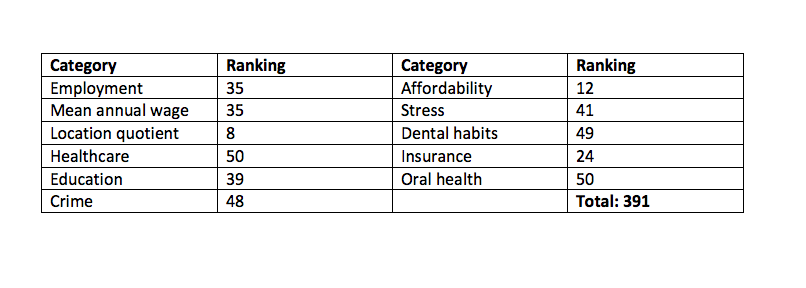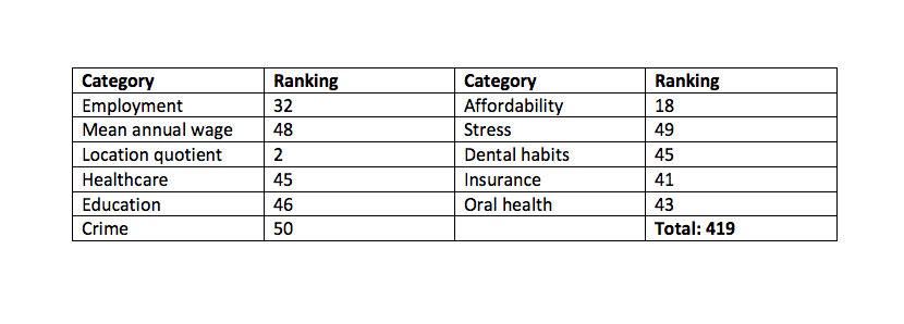 Living conditions in Louisiana are largely to blame for its low score. Louisianans had the worst crime level in the country and they have the second worst stress levels. While the state had an above average cost of living, dental hygienists had the third lowest annual salary ($55,110). Overall healthcare ranked number 45, as did dental habits. Oral health care was slightly better, coming in at 43.