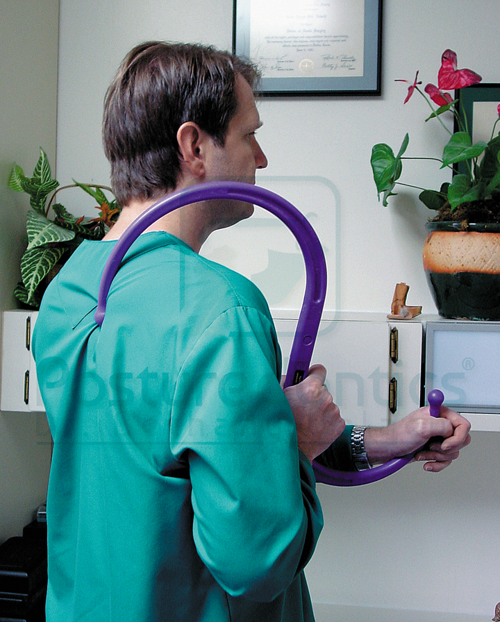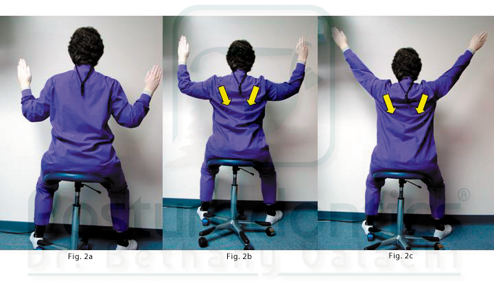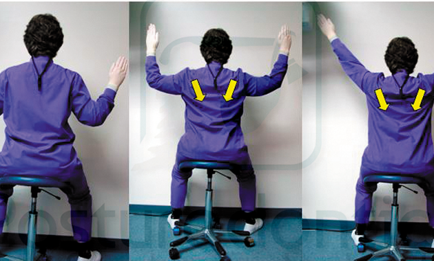 Rounded shoulders (slouching posture) can exacerbate neck pain. The position of the shoulders in this forward position places great strain on the trapezius muscle, which attaches to the cervical vertebrae. This exercise retrains the shoulder girdle muscles to develop healthy, neutral shoulder posture that will reduce neck strain. It can easily be performed chairside with gloves on (Figs. 2a, 2b and 2c).