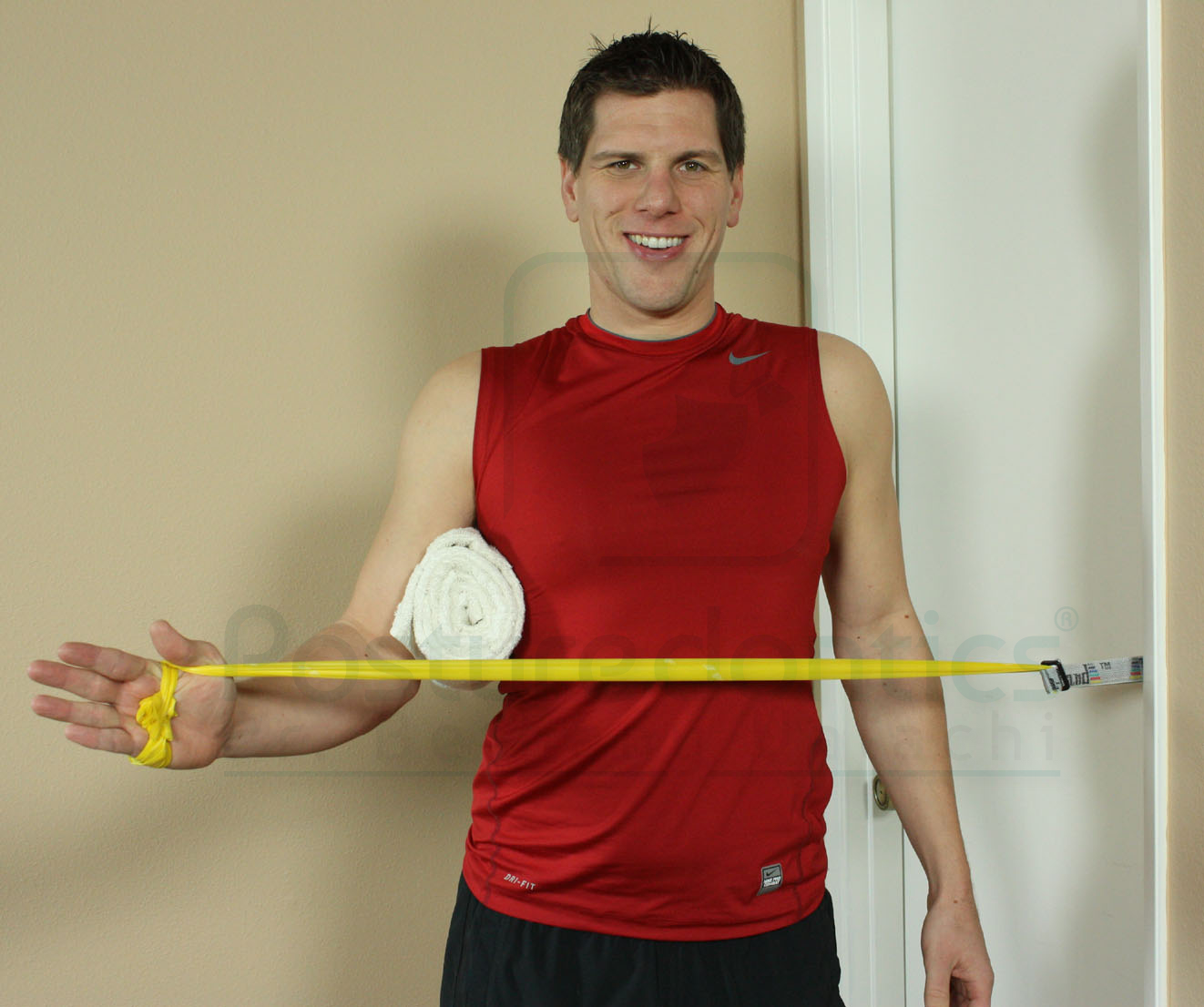 I’m often asked by male dentists if dumbbells give them a better workout than elastic bands. The answer is a resounding no. In fact, the muscle activation obtained by both are comparable (Andersen, Andersen 2010). So, feel free to mix it up for variety if you’d like. You should, however, progress from lighter resistance bands (yellow) to higher resistance bands (red) when the exercise feels too easy.
