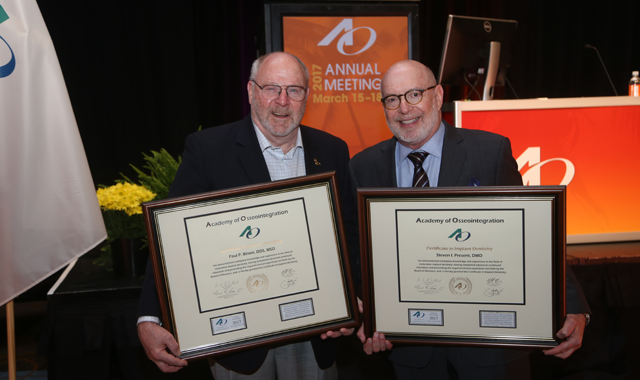 A California prosthodontist and a Pennsylvania general dentist are the first Academy of Osseointegration (AO) members to receive the new AO Certificate in Implant Dentistry.