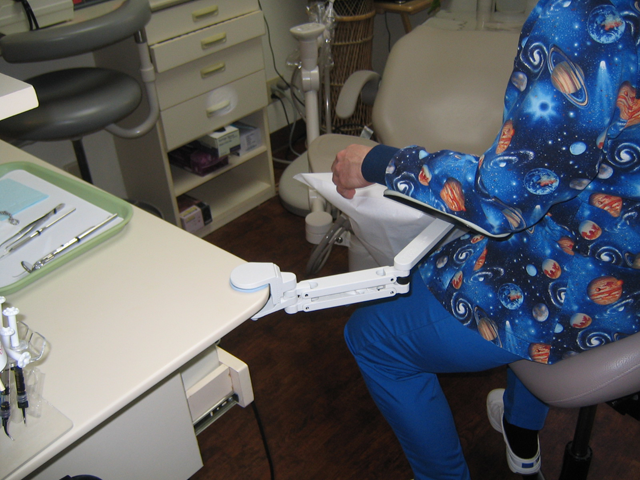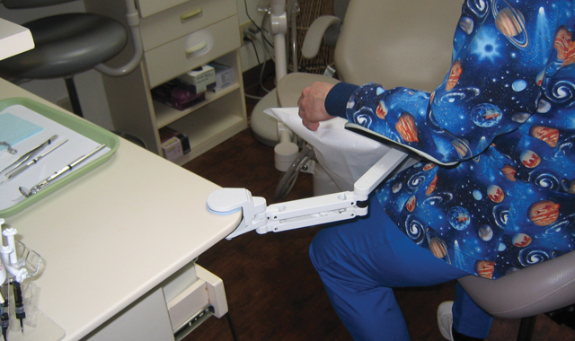 From an ergonomic standpoint, it is desirable to operate with two armrests, however if you have a confined operatory space and find it difficult to maneuver a chair with armrests around the patient, you may want to consider a unilateral armrest fixed to a counter (Fig. 2). Dentists who operate with the left arm resting have been shown to have less pain than those who do not. These are available in a variety of heights to adjust to multiple users and situations.