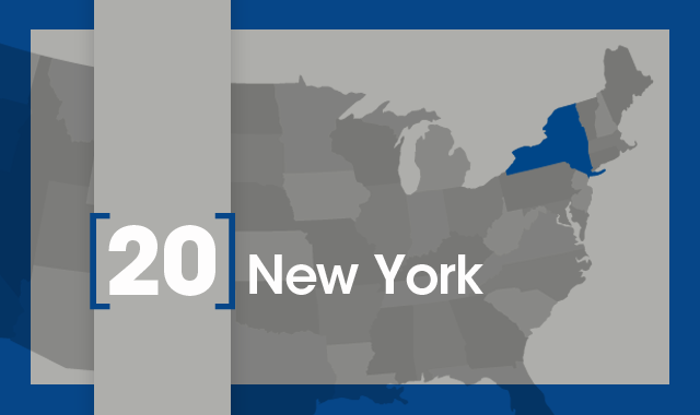 New York jumped up significantly from our 2015 rankings-from number 36 to number 20. That’s despite having the second-highest cost of living, and ranking 45th in patients on Medicaid. However, those numbers are evened out by high numbers of New Yorkers who practice good dental habits (#7) and are financially savvy (#5). New York also, perhaps surprisingly to viewers of literally any crime show, ranks in the top five for low crime concerns and community safety, though some of that is no doubt thanks to the upstate folks. And, if this survey were entirely ranked upon the best pizza, they would be number one without a doubt.