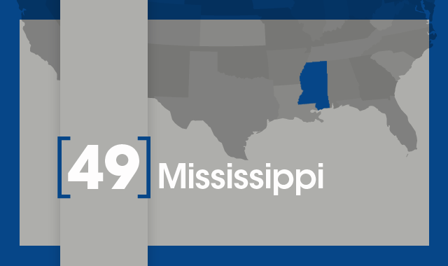 Ranking last in median income and 49th in best oral health, education and percent of visitors, Mississippi drops to the bottom of our list. But look on the bright side – there’s no other place in the country cheaper to live than the Magnolia State.