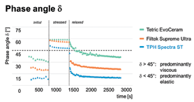 As can be seen, TPH Spectra® ST exhibits low δ-values at low shear-stress, δ-values >45° at high shear stress and returns to low δ-values in the relaxed state. In terms of restoration therapy, this corresponds to an easy extrusion of TPH Spectra® ST from the Compule® Tips, good adaptation and sculptability (high δ-values, predominantly viscous properties) and a high slump resistance when left unagitated (low δ-values, predominantly elastic properties).