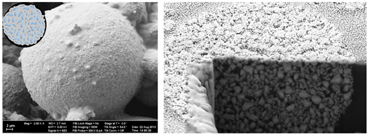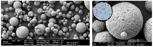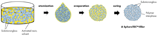 First, a suspension of submicron barium glass in a mixture of solvent and resin is forced through a nozzle and into a hot air stream (atomization). When entering the gaseous phase, the emerging droplets immediately act to minimize their surface energy and form spherical shapes of a distinct size distribution. Due to the increased temperature, the solvent is subsequently evaporated and the initial droplets solidify into preformed particles. Finally, the resin on the particles’ interfaces is thermally cured and the PPF can be collected. Because of the well-controlled processing, fillers from this process can be used as obtained - additional milling is not required. Differently to most PPF, SphereTEC™-fillers are consequently characterized by a high degree of sphericity and distinct microstructure (Fig. 2).