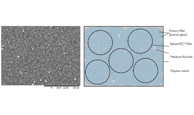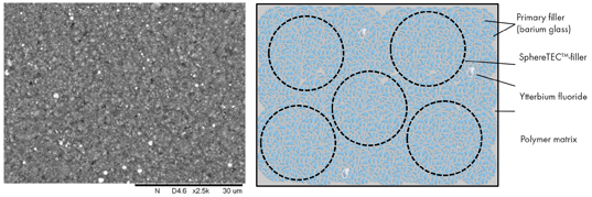 For TPH Spectra® ST formulation, SphereTEC™-PPF and activated resin are combined with additional submicron glass. This is identical to the one used in the SphereTEC™-PPF and helps to further increase the packing density. Furthermore, a common radiopacifier, ytterbium fluoride, is added. Upon mixing, SphereTEC™-fillers fully blend into the overall composition, and are not distinguishable from other parts of the filler system (Fig. 4).