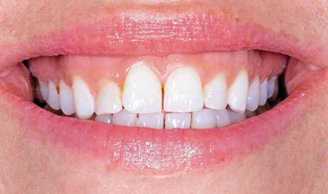 Hard tissue crown lengthening on tooth Nos. 4-13 was completed by a periodontist (Charles Goodman, DDS; Chicago, Ill.), and the patient was allowed to heal for eight weeks.