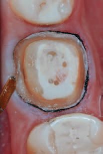 Our patient presented with pain in a lower first molar, which was restored with a failing ceramic restoration complicated with a periapical radiolucency caused by a necrotic pulp.