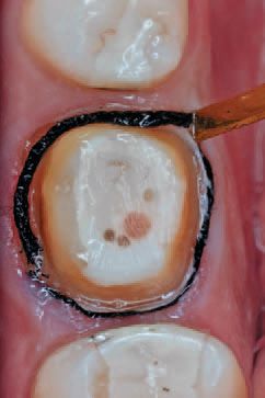 Fig.1 shows the molar re-prepared for a full coverage ceramic restoration and the initial placement of a slightly wetted #000 Re-Cord Knitted Retraction Cord from Clinician’s Choice so it would easily slip into the sulcus without attaching to the gingival tissues.