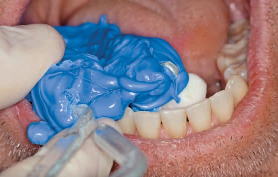 The dual-arch tray should not be ready before nor should it be ready after, as both materials need to set simultaneously. The Quad-Tray Xtreme is inserted with the patient closing passively into the acquired centric relation and the impression material is allowed to set (Fig. 7).