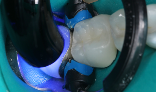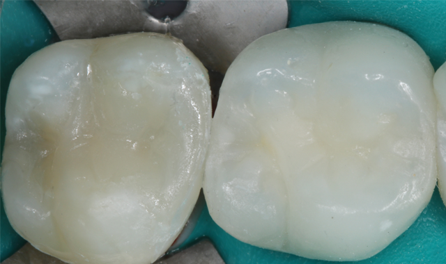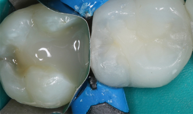 The adhesive was air-thinned with an A-dec air dryer to deliver oil- and moisture-free air and was light-cured for 10 seconds with a Bluephase® Style (Ivoclar Vivadent).