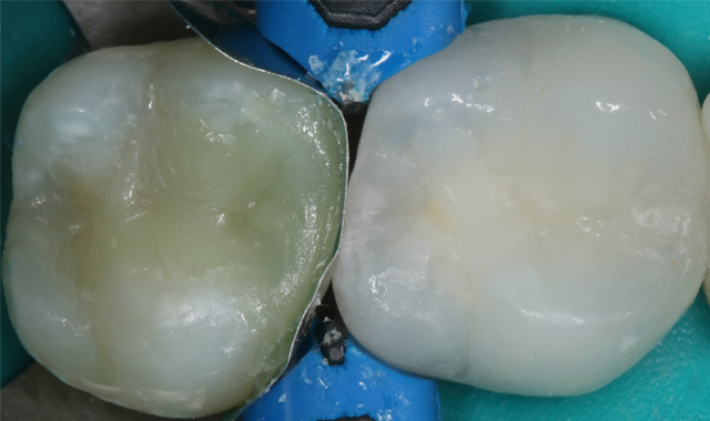 Tetric EvoFlow Bulk Fill Shade IVA was placed as a first increment. While traditional flowable materials need to be placed as a thin increment to minimize shrinkage stresses and allow for complete curing, Tetric EvoFlow Bulk Fill can be placed in increments of up to 4 mm without worrying about shrinkage stresses or incomplete curing. Taking advantage of Ivocerin® and its self-adapting and opacifying technologies means that practitioners get void-free restorations in the deepest of boxes, and the dark underlying tooth structure is blocked out with a similar dentin-like opacity. Figures 8 and 9 show before and after curing.