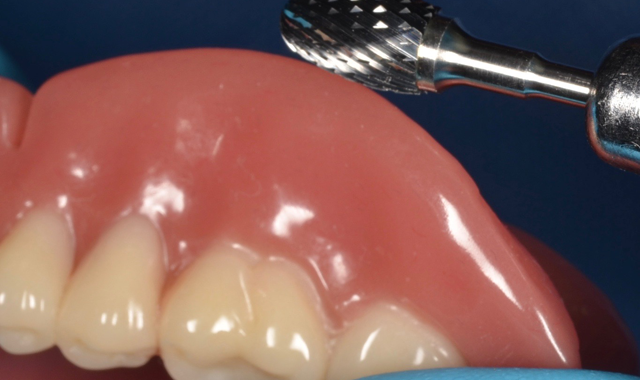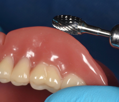 Use the H251E.HP.060 carbide to roughly trim the prosthesis (Fig. 8). The ovoid shape of the bur facilitates precise modifications of the denture base.