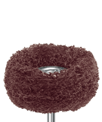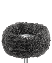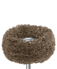 Once the denture base has been sufficiently trimmed, pre-polish the base with the 9485C coarse abrasive buff (Fig. 9). This step removes any excess acrylic that may still be on the denture base following gross adjustment.