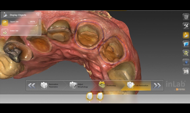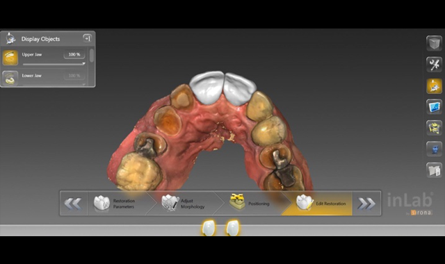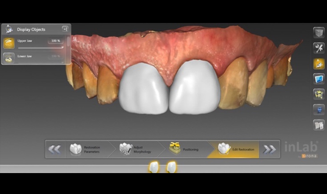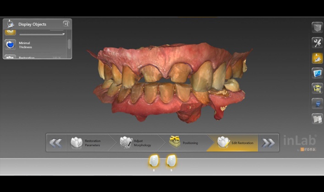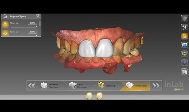 Here is the beautiful crisp, clear image sent over that shows the case that we received at the lab. The image was sent through the Sirona Connect portal, and was scanned with Dentsply Sirona’s OmniCam by the doctor. Using my inLab (Dentsply Sirona) software, I was able to view the image and start to work on designing the restoration with the “edit restoration” function. This particular image shows the complete facial view with all upper and lower opposing contacts, and in occlusion (Figs. 6-7).