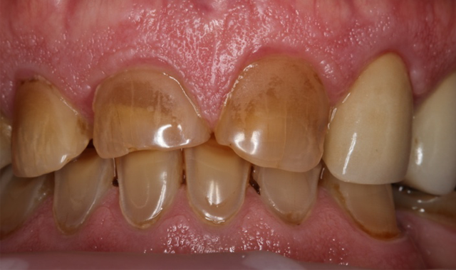 Patient presented with chipped, worn and discolored teeth #8 and #9. Teeth #10 and #11 had PFM crowns placed approximately 15 years prior. The challenge we faced was to not only match the fifteen-year-old crowns on #10 and #11, but to blend #8 and #9 as far as shape, hue, value and saturation (Figs. 1-2).
