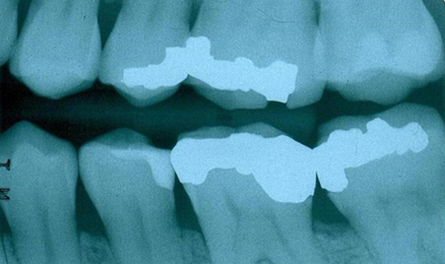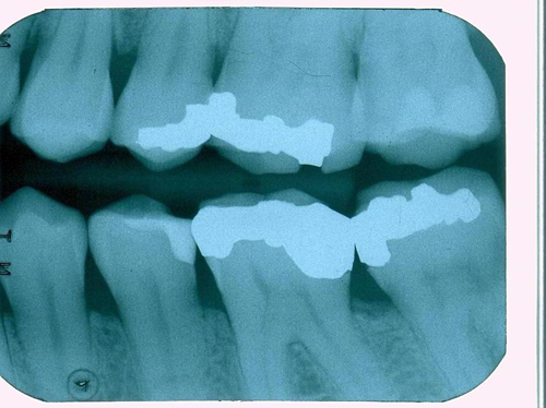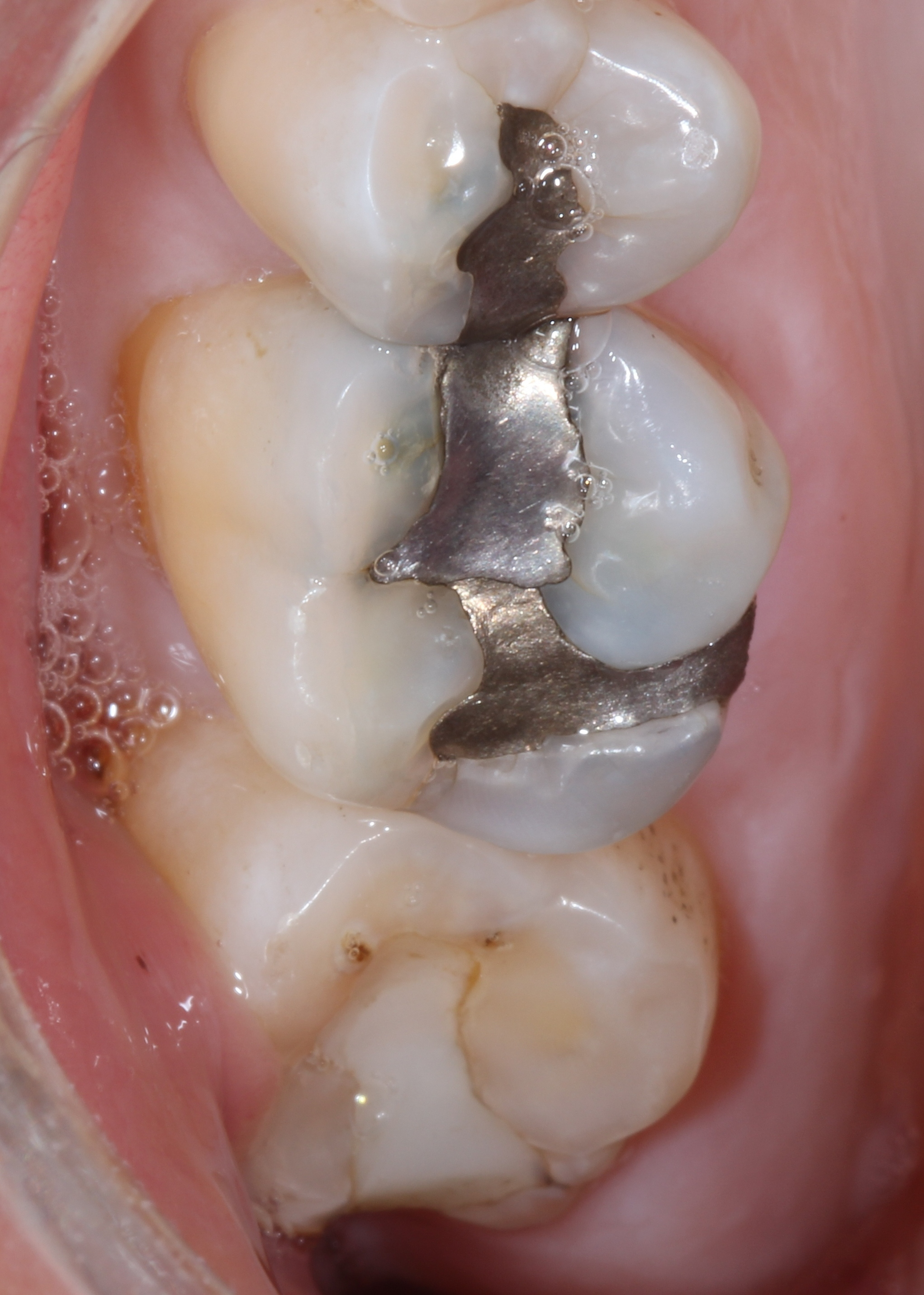 In this clinical situation, the patient had been complaining of pain on the maxillary left side. Visually, the restorations appeared worn but the margins were intact (Fig. 1). A bitewing radiography did not reveal any radiolucency around the restorations on the teeth (Fig. 2).