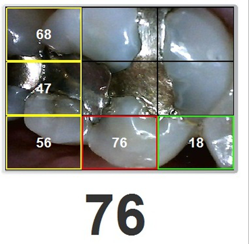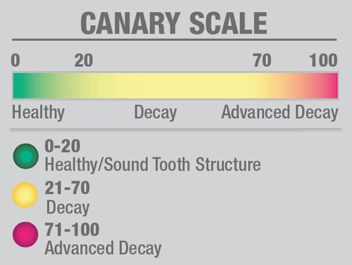 The Canary System creates a Canary Number (ranging from zero to 100) from an algorithm combining the PTR and LUM readings, which are directly linked to the status of the enamel, dentin or cementum crystal structure22 (Fig 4). A Canary Number of less than 20 indicates healthy crystal structure. A Canary Number greater than 70 indicates a large lesion that may justify restoration. Canary Numbers falling between 20 and 70 indicate the presence of early carious lesions or cracks that may require restoration, particularly at restoration margins.23 If the caries is located beneath a healthy layer of enamel, The Canary measures both healthy tissue and caries. The healthy crystal structure overlying the caries dampens the signal, decreasing The Canary Number.