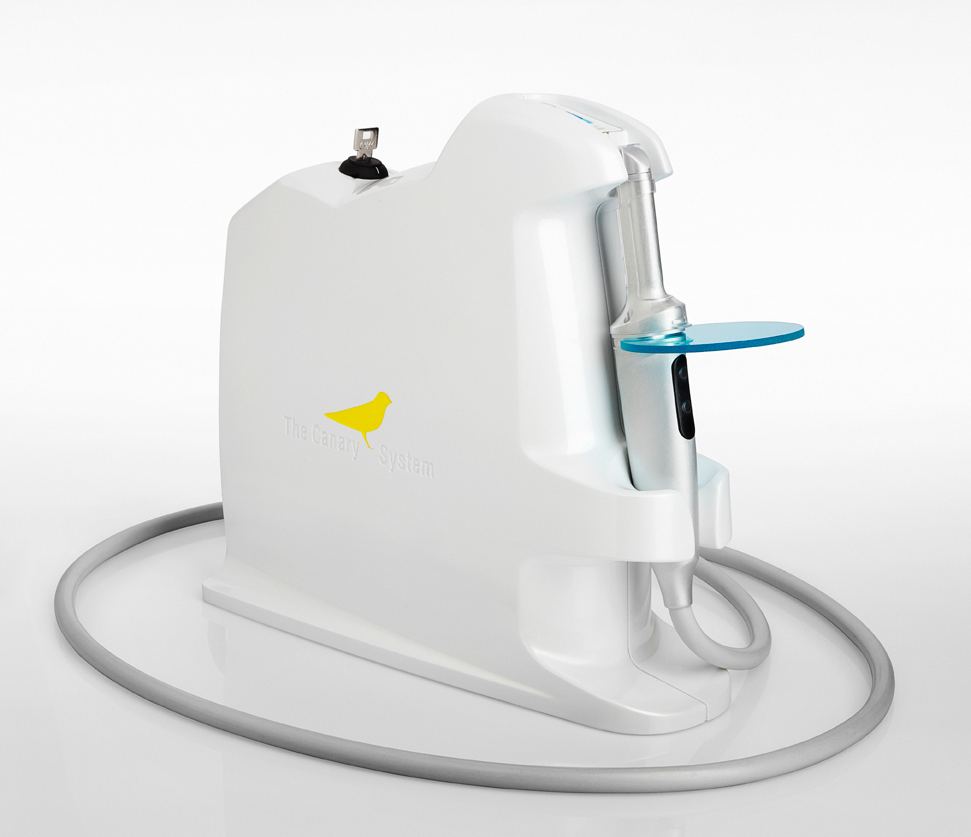 The Canary System (Fig. 3) uses energy conversion technology (PTR-LUM) to image and examine the tooth. Pulses of laser light are aimed at the tooth, and the light is then converted to heat (Photothermal Radiometry or PTR) and light (luminescence or LUM), which are emitted from the tooth surface between pulses. These harmless pulses of laser light enable the clinician to examine sub-surface caries up to 5 mm below the surface.17, 18