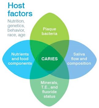 The etiology of dental caries is multifactorial. The chart to the left offers a visual guide. Streptococcus mutans and lactobacilli are bacteria found in biofilm that are highly cariogenic. Their cariogenic action has four aspects considered as separate effects:3