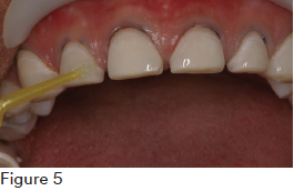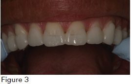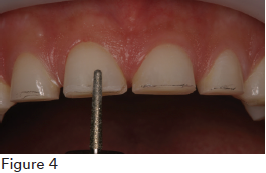 The temporaries were then tried in (Fig. 3) and a minor rounding was done to prepare each tooth (Fig. 4). This was done without any anesthetic, as the preparations were minimal.