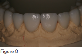 Based on a prior impression, the lab created final restorations using IPS eMax for the upper arch (Fig. 8). The patient returned and after a try-in, the intaglio surface of the restoration was salinated and the entire preparation was etched (3M™ ESPE™ Scotchbond™ Universal Etchant). Scotchbond Universal Adhesive was then applied to the restoration and preparation. The final restoration was cemented using 3M™ ESPE™ RelyX™ Veneer Cement. Upon placement, excess cement was extruded from the restoration and was easily cleaned up. The same process was completed for the remaining teeth.