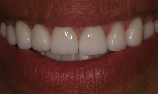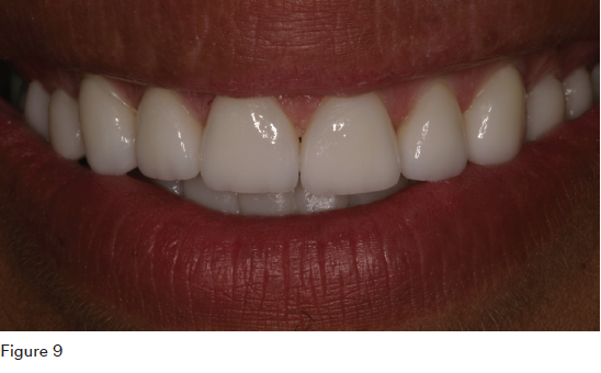 The final restorations (Fig. 9) provided the patient with a smile he was proud to show off and it was completed using an extremely conservative treatment. The margins were supragingival due to the minimal preparation and undercut of the teeth and a very minor esthetic compromise was made in order to preserve tooth structure. This was augmentation, not amputation of the teeth. If the patient wants to reverse treatment in the future, he can do so without the negative consequences that would have occurred when bonding and cementing to dentin and the more aggressive preparations needed for crowns. The patient is planning to complete treatment on the lower arch at a future date.