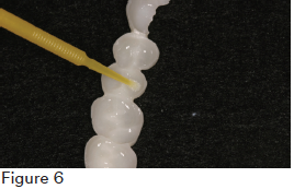The temporaries were then air abraded and the teeth were spot etched. A thin layer of 3M™ ESPE™ Scotchbond™ Universal Adhesive was placed on the intaglio surface of the restoration and on the teeth (Figs. 5, 6).